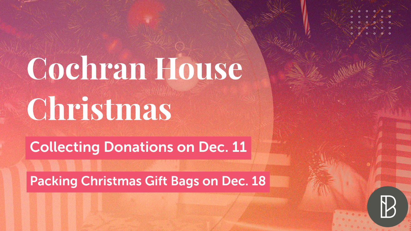 We want to bless the residents at the Cochran House with some Christmas Gifts! You can give online to help purchase gifts and then on the 18th, after the bKidz Christmas Play, stick around to help pack gift bags!
